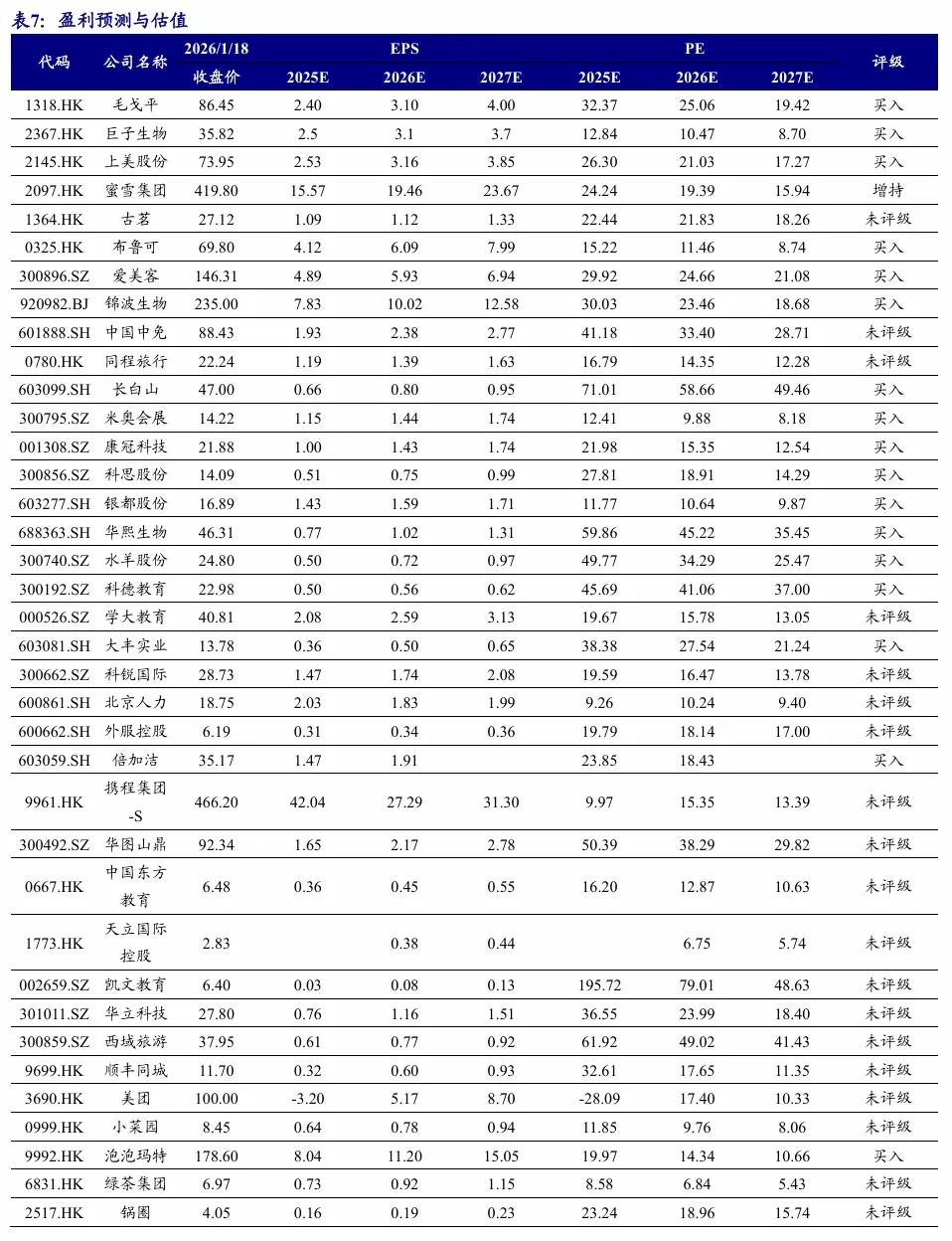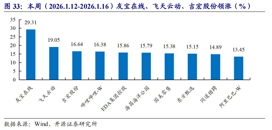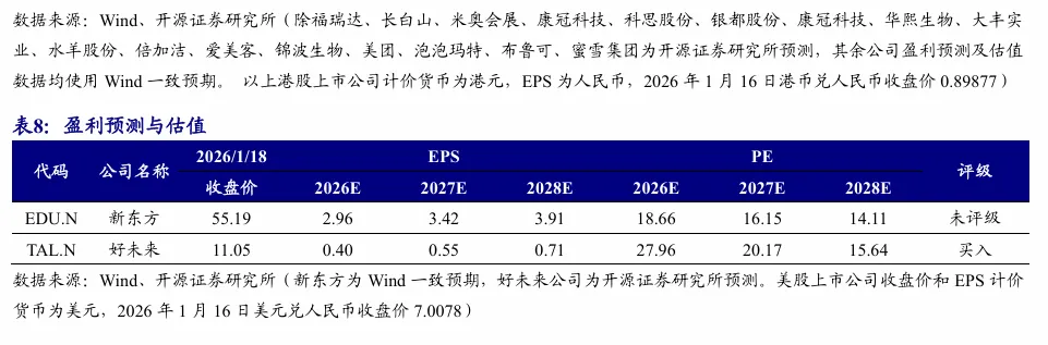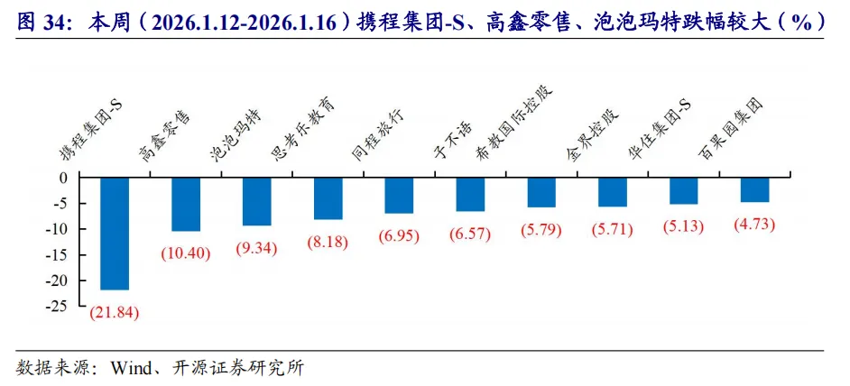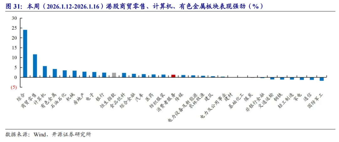 本周行情:港股零售板块跑赢恒生指数,消费者服务/传媒跑输恒生指数本周(2026.1.12-2026.1.16)港股消费者服务/传媒/商贸零售指数+1.32%/+1.16%/+11.68%,较恒生指数涨跌幅-1.02/-1.18/+9.34pct,在30个一级行业中排名第15/16/2;本周传媒类标的上涨排名靠前。推荐标的:(1)旅游:长白山;(2)教育:好未来、科德教育;(3)餐饮/会展:特海国际、米奥会展;(4)美护:科思股份、水羊股份、康冠科技、倍加洁。受益标的:(1)餐饮:蜜雪集团、古茗、小菜园、锅圈;(2)IP:泡泡玛特、布鲁可、华立科技、青木科技;(3)美护:毛戈平、上美股份、若羽臣、巨子生物、四环医药;(4)新消费:美图、赤子城科技;(5)即时零售:美团-W、顺丰同城;(6)旅游:长白山、同程旅行、携程集团-S、大麦娱乐;(7)教育:中国东方教育。项目落地不及预期,社会零售不及预期,行业竞争加剧等。
