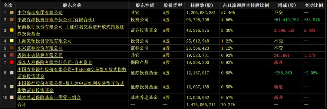 中谷物流全称上海中谷物流股份有限公司,于2010年3月在上海成立,2020年9月25日在上交所上市。中谷物流是中国最早专业从事国内沿海集装箱货物运输的企业之一,公司业务模式是以水路运输为核心,以标准化集装箱为载体,提供多式联运全程物流服务。截至2024年12月31日,公司已运营船舶111艘,总运力达21.3万TEU,集装箱船队规模排名全国第二。二、公司股东