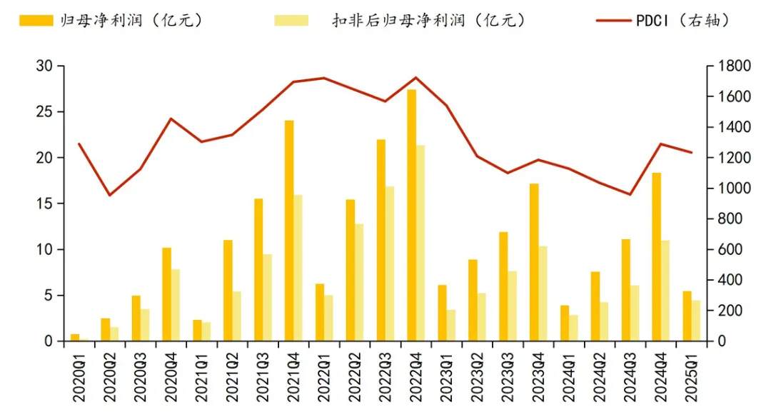 截至2025-09-30,十大股东合计持股比例70.24%,实际控制人为卢宗俊。股东人数截至2025-09-30,共27315户。公司主要业务为集装箱物流服务,整合全国范围内的铁路及公路资源,形成“公、铁、水”三维物流网络,建立了以水路运输为核心的多式联运综合物流体系。公司采用内外贸协同发展的经营策略。内贸集装箱物流服务主要分为港到港服务(CY-CY)和多式联运服务两种。多式联运服务根据客户的不同选择,主要可细分为门到门业务(D-D)、港到门业务(CY-D)及门到港业务(D-CY)。 外贸集装箱航运以期租方式出租部分船舶运营外贸航线。公司运输主要货种包括纸制品、钢铁、食品、塑料粒子等大宗货品与生产资料,公司前十大货种占公司总运量的比例为56.84%,货物以基础货源为主。随着“散改集”战略的持续深入,未来基础货源的增长仍然为公司收入增长的基石。公司水运业务单价走势与泛亚航运公布的泛亚内贸集装箱运价指数(PanasiaDomesticContainerIndicator,PDCI)的走势高度一致。泛亚内贸集装箱运价指数,由泛亚航运自主开发制定并发布,客观反映了其内贸市场实际成交运价波动趋势,是内贸集装箱运输业客户掌握、预估物流成本的重要指标。该指数以2015年第 23 周(2015年5月30日-6月5日)为基期,基点为1,000点,在该基点基础上,其后续变动主要代表内贸集装箱运价的波动趋势,而不代表具体运价价格信息。公司外贸收入主要为租船收入。公司船队匹配外贸市场对中小型船舶的需求,2020年下半年起试点外贸租船业务,后续随着外贸集装箱航运市场景气度波动,公司灵活调整外贸市场的运力投放,逐步实现外贸业务与内贸业务的有机结合。现阶段,公司租约期限结构逐步改善,且2025年合约租金有所提升。公司外贸租船的长期合约比例逐步提升,期限结构从2022~2023年不足1年的期限为主,逐步改善至2025年的均为约2年或约3年。2024年实现17.42亿元,同比增长41.36%,占营收比重为15.47%;2025年上半年实现14.11亿元,同比增长145.57%,占营收比重为26.44%。截至2025-09-30,资产负债率为59%,净资产收益率为13%声明:以上数据来自网上公开资料,为本人了解公司业务整理,不构成任何投资建议。