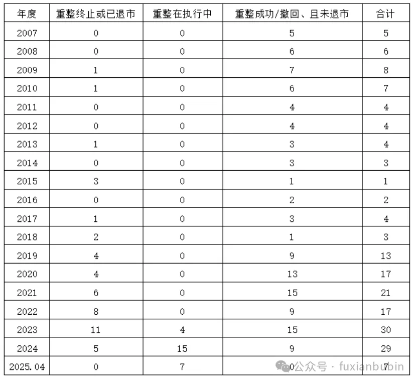 经梳理,目前上市公司进入破产重整的原因较为多元,主要包括宏观经济下行、相关政策趋严、融资环境变化、主营业务收入下降、行业周期影响、经营战略失误、控股股东/实际控制人非经营性资金占用等,导致公司出现流动性困难、无法清偿到期债务等。从2007年《企业破产法》出台开始起算,各年度重整情况统计分析如下: