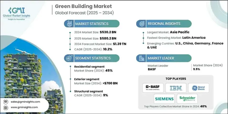 全球绿色建筑市场正经历高速增长,预计到2034年市场规模将达到1.39万亿美元。