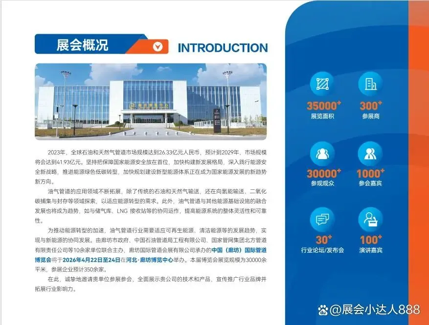 同期活动中国国际管道大会:展会期间将举办多场论坛活动,包括 1 场高峰主论坛和 6 场专题论坛。主论坛将于 2026 年 4 月 22 日在廊坊国际饭店怀远堂举办,预计规模 500 人,将邀请国内外知名油气与新能源储运行业产业链的领袖专家,围绕世界能源新格局、储运发展新趋势等进行深入探讨。专题论坛包括第五届油气管道维抢修技术交流会、第五届全国油气管道内检测技术交流会、能源地下储存交流会、数字化与智能化管网交流会、液化天然气储运建设技术交流会、管道防腐保温技术创新交流会等,预计各论坛规模在 150 人至 200 人不等。