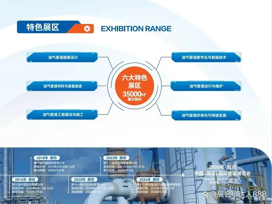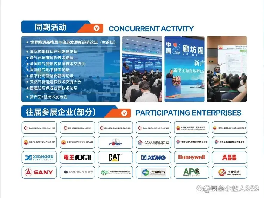 基本信息:中国国际管道大会:展会由中国石油、中国石化、中国海油、国家管网集团支持,廊坊市人民政府、中国石油管道局工程有限公司等 9 家单位联合主办,廊坊国际管道会展有限公司承办。该展会始创于 2002 年,已成为亚太地区历史悠久的油气储运等领域的综合型专业盛会。