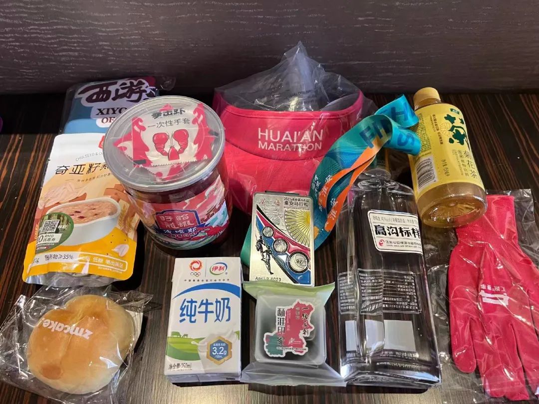 此外,诚意满满的还有赛事的完赛包,除了基本的赛事物料,组委会还给每位跑者送上了一盒小龙虾和一瓶白酒,单论完赛包就已经值回了报名费。