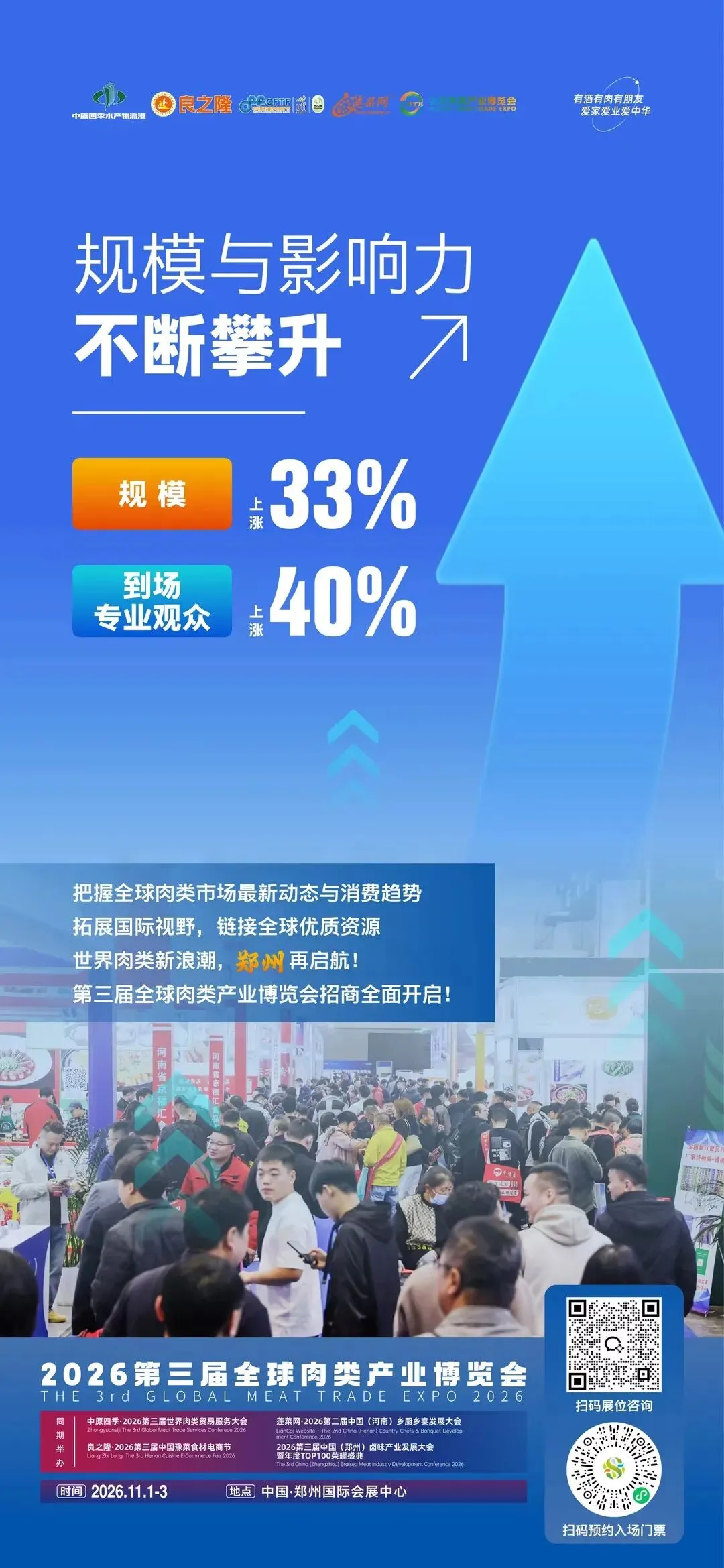 本届展会旨在打造一个贯通肉类全产业链,集商贸对接、趋势发布与文化展示于一体的全球行业盛会。届时,全球肉类企业、餐饮精英、品牌领袖及产业链配套服务商将齐聚中原,共赴一场“有酒有肉有朋友”的行业之约。