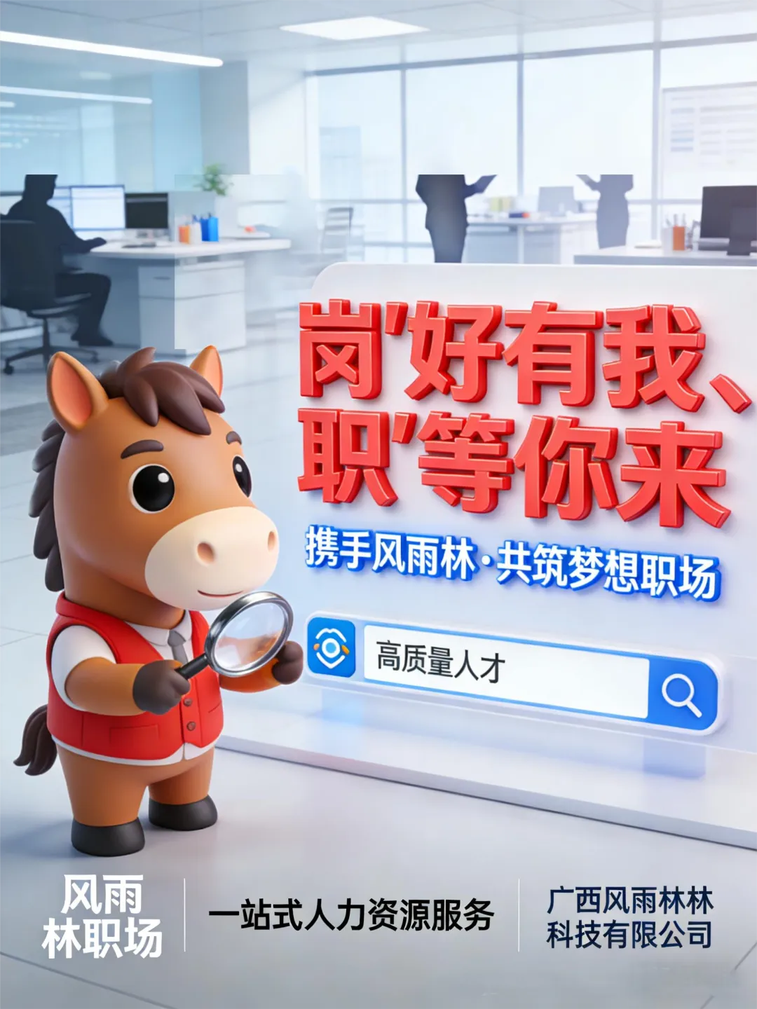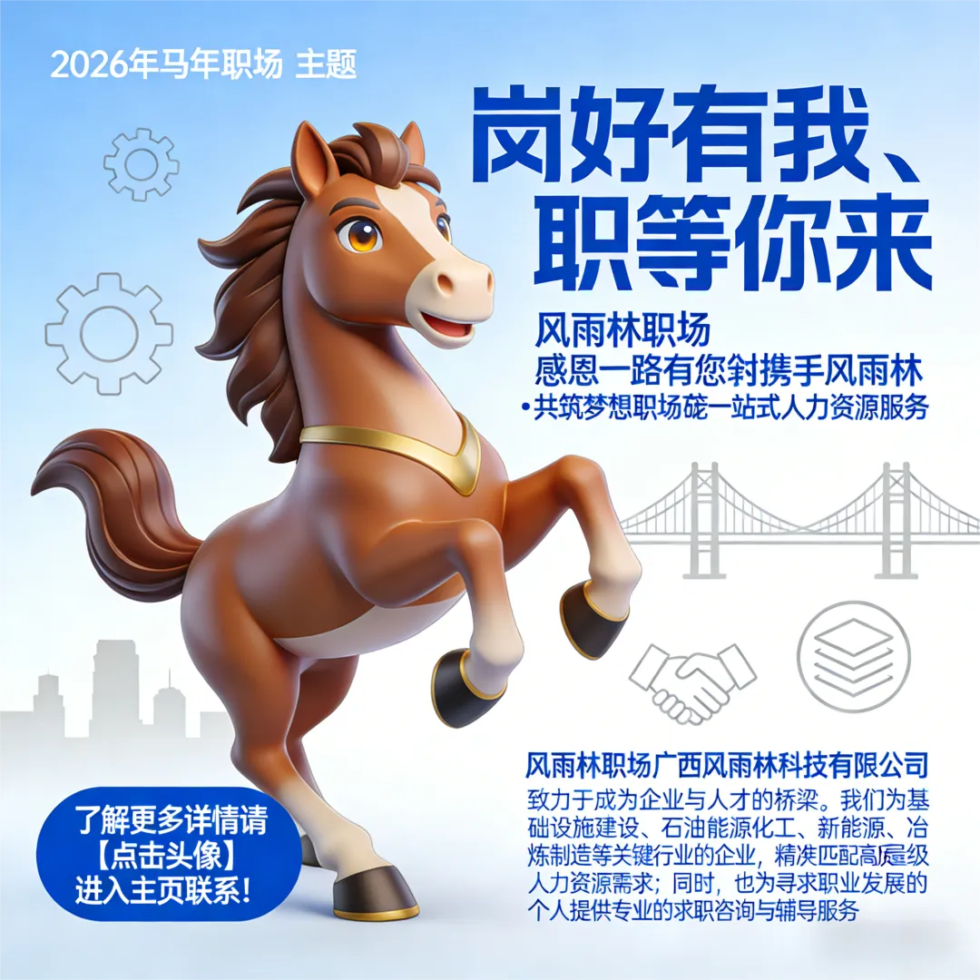 广西风雨林科技有限公司旗下风雨林职场,致力于成为企业与人才的伯乐之桥。我们深耕基础设施建设、石油能源化工、新能源、冶炼制造等关键行业,为企业精准匹配合格英才,高效解决各层级人力资源需求;更化身求职者的千里马助推器,提供专业求职咨询、简历优化、岗位匹配全流程辅导,助你在马年觅得心仪岗位,驰骋职场新赛道!