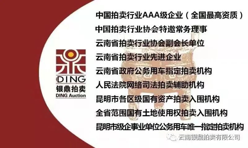线上报名:具备完全的民事行为能力的公民、法人和其他组织均可参与竞买(竞买人须在中拍平台上实名注册)。如参与竞买人未开设中拍账户,可委托代理人(具备完全民事行为能力的自然人)进行,但须在竞买开始前向云南银鼎拍卖有限公司办理委托手续;竞买成功后,竞买人(法定代表人、其他组织的负责人)须到云南银鼎拍卖有限公司办理交接手续。因不符合条件参加竞买的,由竞买人自行承担相应的法律责任。我公司及委托方有权对竞买人的竞拍资格进行审核,经审核确认后在报名截止前将保证金汇入指定账户(户名:云南银鼎拍卖有限公司,开户行:招商银行昆明分行小康大道支行,账号:871902449710602)后方可取得竞买资格。拍卖会上未竞得者,保证金在5个工作日内全额无息退还;