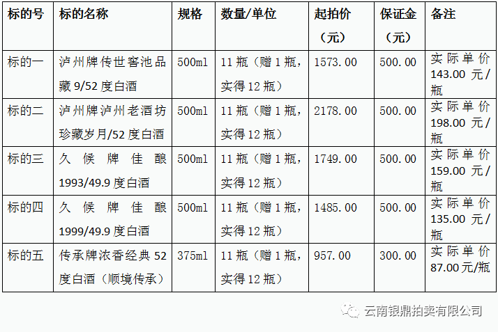 六、拍卖保证金:1、标的物保证金:(1)标的一:泸州牌传世窖池品藏9/52度白酒,人民币伍佰元整(¥500.00元);(2)标的二:泸州牌泸州老酒坊珍藏岁月/52度白酒,人民币伍佰元整(¥500.00元);标的三:久候牌佳酿1993/49.9度白酒,人民币伍佰元整(¥500.00元);标的四:久候牌佳酿1999/49.9度白酒,人民币伍佰元整(¥500.00元);标的五:传承牌浓香经典52度白酒(顺境传承),人民币叁佰元整(¥300.00)。