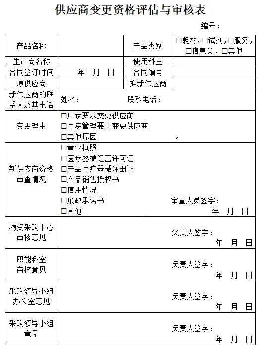 处理程序:生产厂家原则上需提前3个月出具变更供应商的书面告知函,提供原供应商确认终止代理并主动放弃的申明及新供应商的产品销售授权等材料,经采购中心核查符合条件后,填报《供应商变更审批表》,并附相关证明材料,经逐级报批至采购领导小组组长审批同意后执行变更;若不能提供原供应商确认终止代理并
