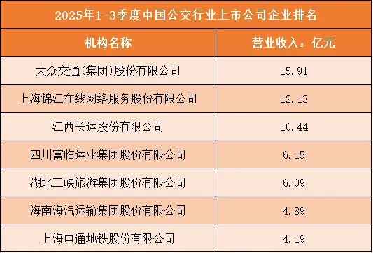 根据申万行业分类,2025年1-3季度中国公交行业上市公司按营业收入排名如下:(A股上市公司)