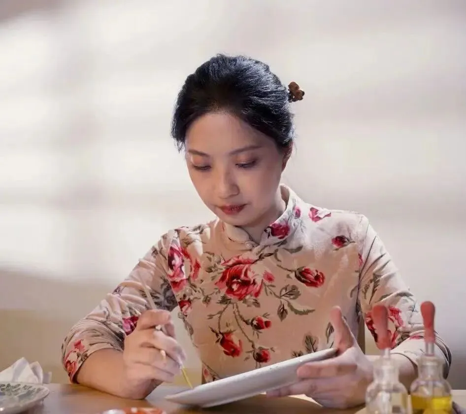 然后滑板到了许珺茹女士手中,她用广彩技法细细勾勒、上色、上釉。广彩的艳丽繁华,遇上陶坯的质朴温润,这本身就是一场对话。