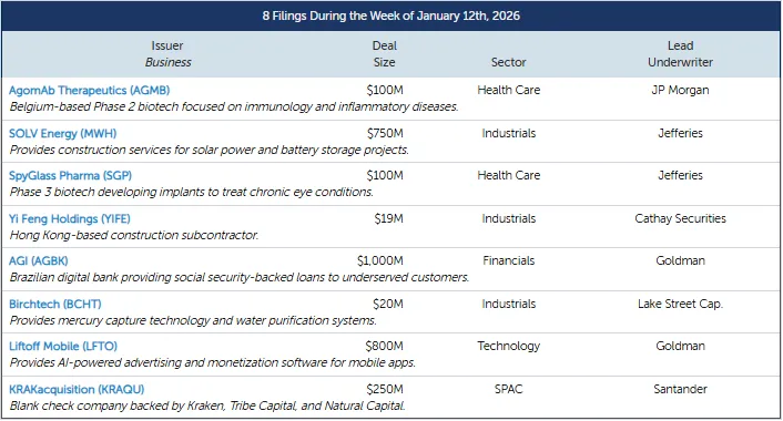 上周共有八家公司提交了IPO申请,其中五家公司计划融资1亿美元或以上。领跑的是巴西数字银行AGI ( AGBK ),该公司计划融资约10亿美元。移动应用广告软件提供商Liftofff Mobile ( LFTO ) 计划融资约8亿美元。专注于太阳能发电的建筑公司SOLV Energy ( MWH ) 计划融资约7.5亿美元。