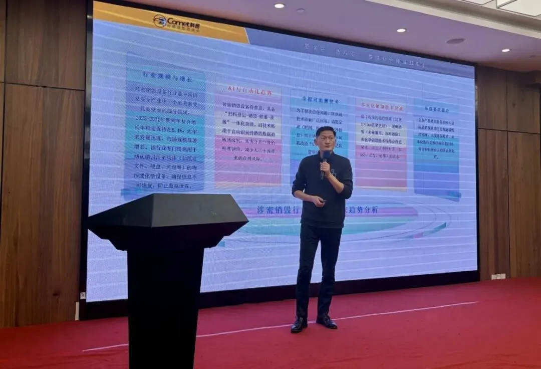 现场,科密区域经理沈方明系统展示了覆盖数据销毁末端的全链条解决方案。从达到国家一级保密标准(粉碎效果达1x1mm)的高保密碎纸机,到高效硬核的硬盘消磁销毁一体机,再到每小时处理能力高达3000公斤的大型销毁中心系统……科密的涉密销毁产品矩阵,实现了对纸张、硬盘、光盘、芯片等全类型涉密介质的“不可逆彻底销毁”。