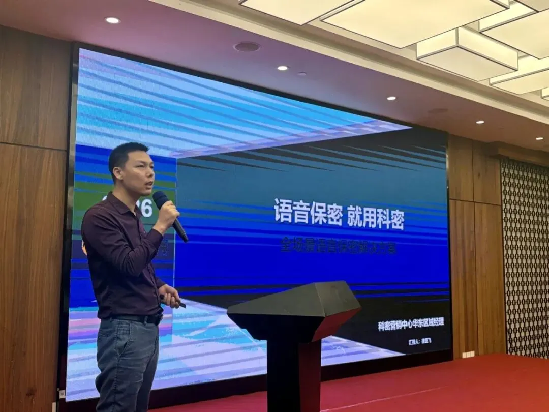科密区域经理徐亚飞详细介绍了“声盾”系列产品。在会议室、洽谈室、移动座驾等声音泄密高风险场景,科密自主研发的超声波干扰技术,能有效阻断非法拾音,让窃密设备“录而无获”。从桌面式到便携式,从办公用到车载用,科密已构建起业内最完整的产品矩阵,正引领一个全新安全品类的蓬勃发展。