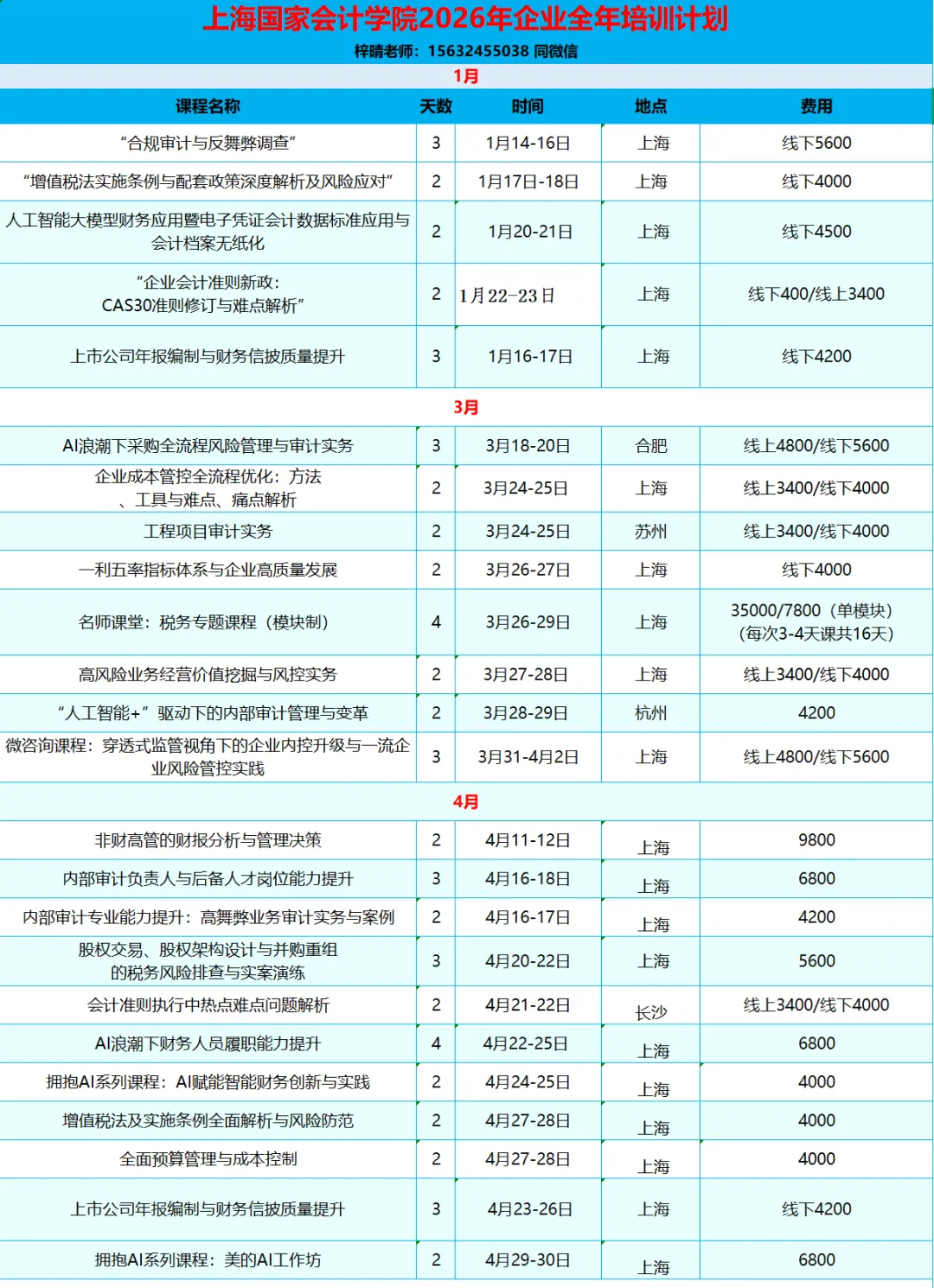 七、收费标准1.培训费:线下5600元,线上4800元。 2.食宿统一安排,费用自理(具体标准以开课通知为准)。3.费用支付方式:培训费由上海国家会计学院收取,支付宝/微信扫码、汇款。食宿费由酒店收取,现场支付。