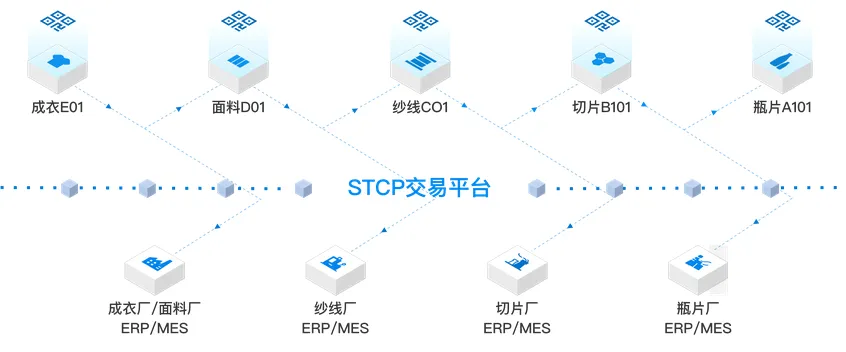 从再生料回收、原料交易、纱线交易、面料交易、成衣零售,通过回收商、纱线商、面料商、成衣商一直到消费者,在平台中进行行为与数据上链,所有交易相关信息上链,整个产业链上下游所有生产、检验、物料信息上链。同时,利用区块链的分布式账本、多方共识记账、区块的链式结构、智能合约、通证等技术特点,做到数据防丢失、防篡改、易追溯、自动执行、权益机制等特性,最终实现交易可信、产业可信等。在平台使用环节,上下游之间可以开具电子交易证书,并根据上链企业数据透明度,发放认证证书。
