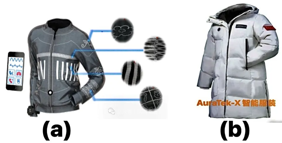 说到服装产品首先我们得说明一下智能服装服饰产品情况。在人工智能发展的推动下,中国智能服饰市场增长显著,其产品正从运动健康领域向更广泛的日常应用拓展。2024年中国智能可穿戴市场规模已突破1300亿元,预计到2028年将增长至约2718亿元,年复合增长率可达20%。在全球范围内,智能服装产品2023年市场规模约为36.72亿美元,预计到2030年将超过170亿美元。智能服装产品的形成主要得益于柔性传感器、物联网、人工智能等技术的融合以及消费者对健康管理、个性化和功能性服装需求而形成。智能服装产品的功能设计与其适用季节紧密相关,冬季夏季产品各不相同。例如用碳纤维/碳纳米管发热丝、相变材料、远红外蓄热材料等主要技术设计加工成碳纤维智能电热按摩外穿衣、发热式跑步运动套装、智能温控羽绒服等;用单向导湿面料、凉爽纤维、防晒涂层等主要技术设计加工成的快速导汗、防晒等功能服装产品。以上这些产品在我国安踏、七匹狼、中乔体育、江苏阳光、腾飞科技、阿木(深圳)新科技和新兴科技公司等均有生产供给。值得一提的是最近东华大学发明了一种智能纤维做的服装,该服装产品能够感知佩戴者的呼吸、读懂手势,能与佩戴者随身携带的电子设备“对话”,见图一(a);又如云境科技公司依托哈尔滨工业大学在材料科学与可穿戴设备领域的尖端成果,通过跨学科的技术融合与场景创新,致力于推动智能服饰从概念走向日常,成为消费者的必备之选,创下首款智能服饰品牌AuraTek-X。AuraTek-X已推出智能温控羽绒服、智能温控帽围一体、模块化智能温控服装及新一代智能材料服装等一系列创新产品,广泛覆盖日常消费、户外运动等多类场景,见图一(b)。