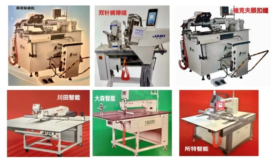 再次介绍一下智能服装加工设备情况。大家知道,1975年美国胜家公司推出了电脑平缝纫机,开辟了电脑控制缝纫机的新时代,而我国杰克公司和富山公司在2023年和2024年间,在全球分别推出了“快反王”平缝机和HX8V-II型线自张力V技术智能包缝机,从此开创了智能缝制设备新时代!如今通过近年的努力,我国服装企业应用的缝制设备其中智能缝纫机已经占到整个缝制设备的70%—80%,这些智能缝纫机有智能平缝机和智能包缝机(见图二)、有智能缝制单元机和智能模板机(见图三)、有模块式缝制工作站(见图四)等等,这些智能设备极大地满足了全球和全国服装制造业的需要。