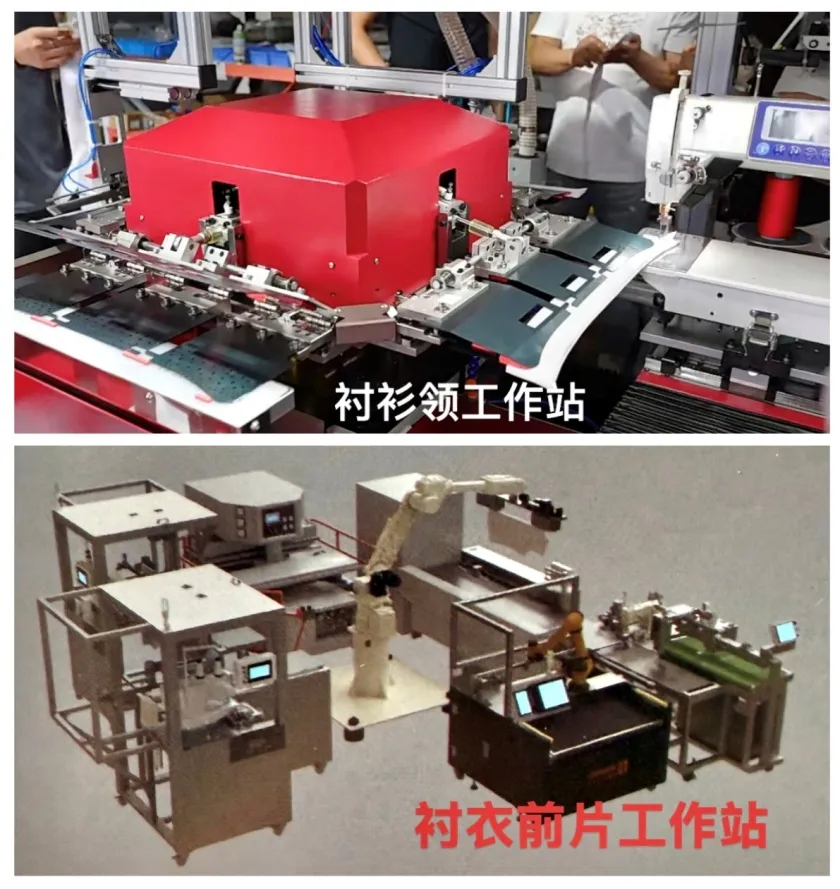 在智能产线建设上,我国匡博公司成功建设了一条衬衫生产线、天源公司成功建设了T恤和文化衫生产线。其中值得一提的是匡博公司的智能衬衫生产线,见图五、图六。