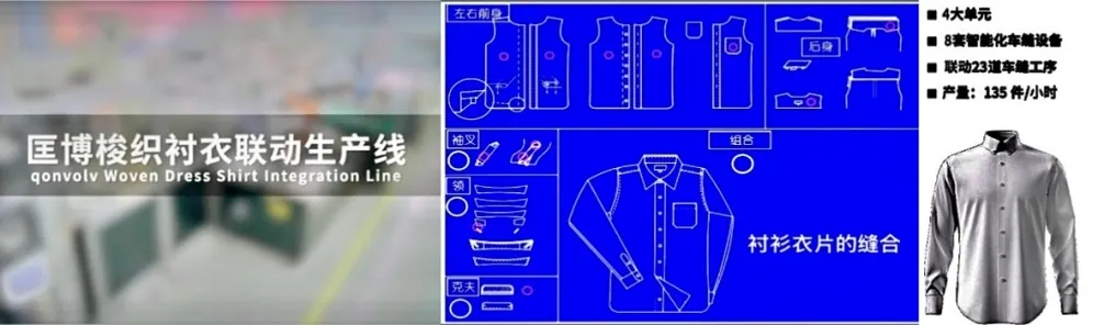 由图五、图六可见,匡博公司所建的智能衬衫生产线用创建了衬衫前片、衬衫领子、衬衫袖口等四大模块工作站,加上其他缝制设备,组成了只有19人的智能生产线,每小时可以缝制135件衬衫,大大提高了生产效率。