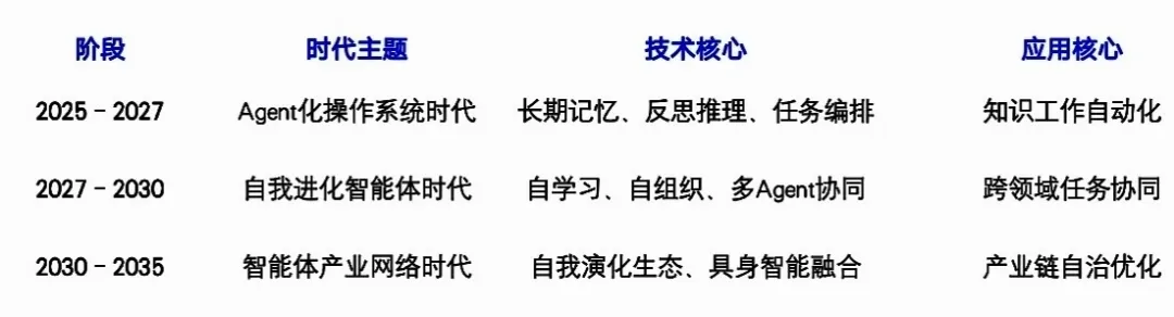 根据国家AI智能体三段式发展战略计划,我们研究和应用AI智能体核心技术和核心应用基本上是这样推进的:从2025—2027年这一段时间基本是智能体操作系统时代,其核心技术在于长期记忆和反思推理等方面,其应用则在于知识工作的自动化;从2027—2030年这第二段时间基本是智能体不断进化的时代,其核心技术在于自组织、自学习和多智能体协同方面,能够做到多任务协同应用;从2030—2035年这第三段时间基本是进入智能体网络时代,其核心技术在于智能体与具身智能深度融合,应用于产业自治优化生态,见图九。