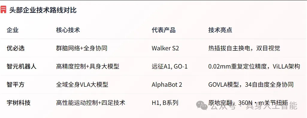当今在我国具身智能产业市场,其人形机器人及具身智能机器人的头部企业主要有四家,它们是优必选、智元、智平方、宇树科技等,它们也代表着不同之技术流派,见图十。