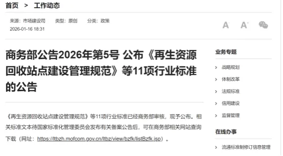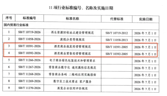 2026年1月16日,商务部通过官网发布2026年第5号公告,正式公布《再生资源回收站点建设管理规范》等11项经审核通过的行业标准。其中,由中国酒业协会牵头修订的《酒类商品批发经营管理规范》(SB/T 10391-2026)和《酒类商品零售经营管理规范》(SB/T 10392-2026)两项酒类流通领域核心标准位列其中。公告显示,此次公布的11项行业标准均将于2026年7月1日同步实施,相关标准文本将在国家标准化管理委员会发布备案公告后,通过商务部流通标准制修订信息管理平台(网址:https://ltbzh.mofcom.gov.cn/ltbz/view/bzfk/listBzfk.jsp)供公众查询下载。