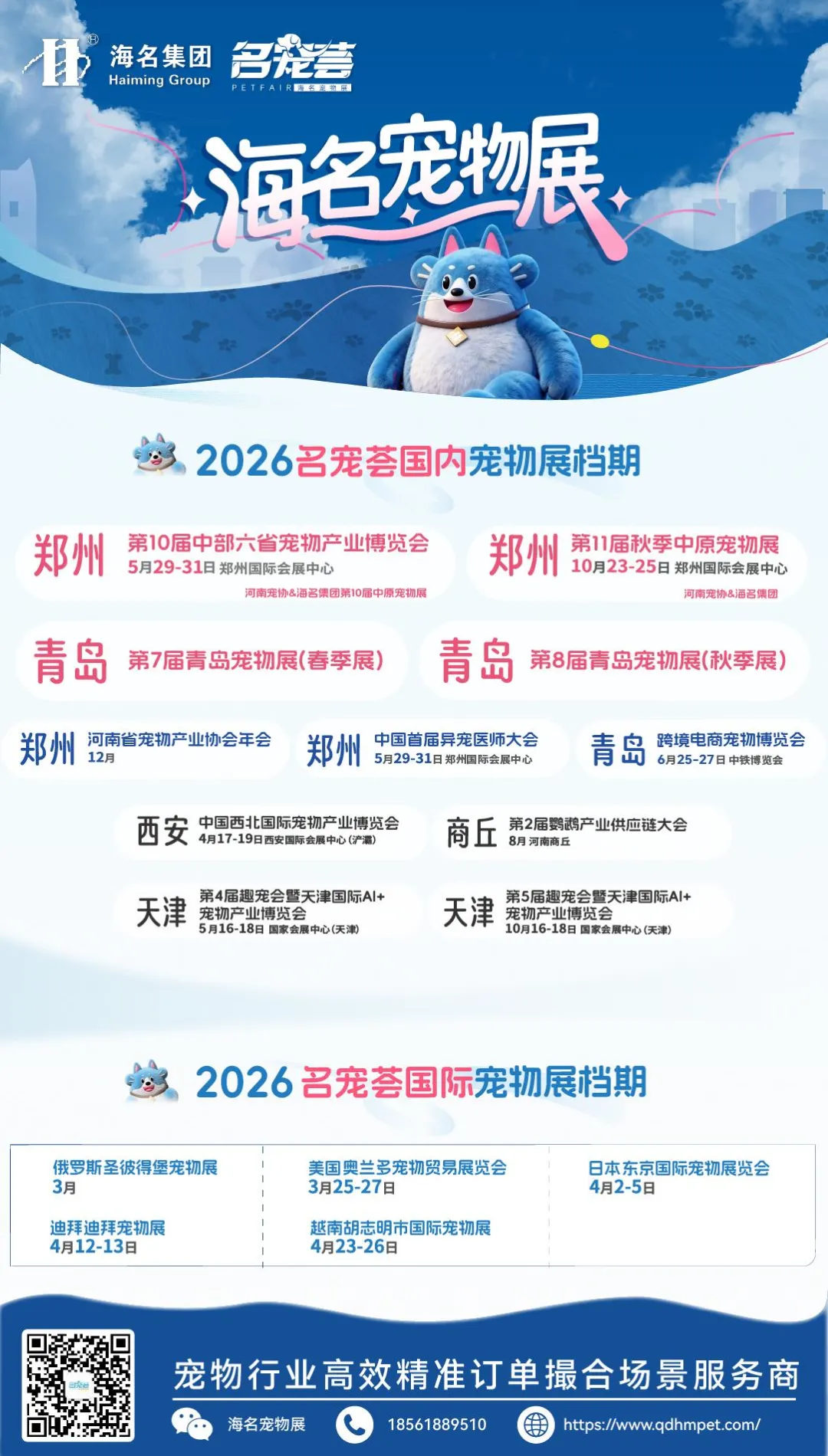 2026年,海名集团已在郑州、青岛布局多场宠物展项目,携手鲁宠协、河南宠协等协会,打造青岛宠物展(春季展)和青岛宠物展(秋季展)、5月29-31日第十届中原宠物展、10月23-25日秋季中原宠物展等核心项目,期待与您携手共拓新商机