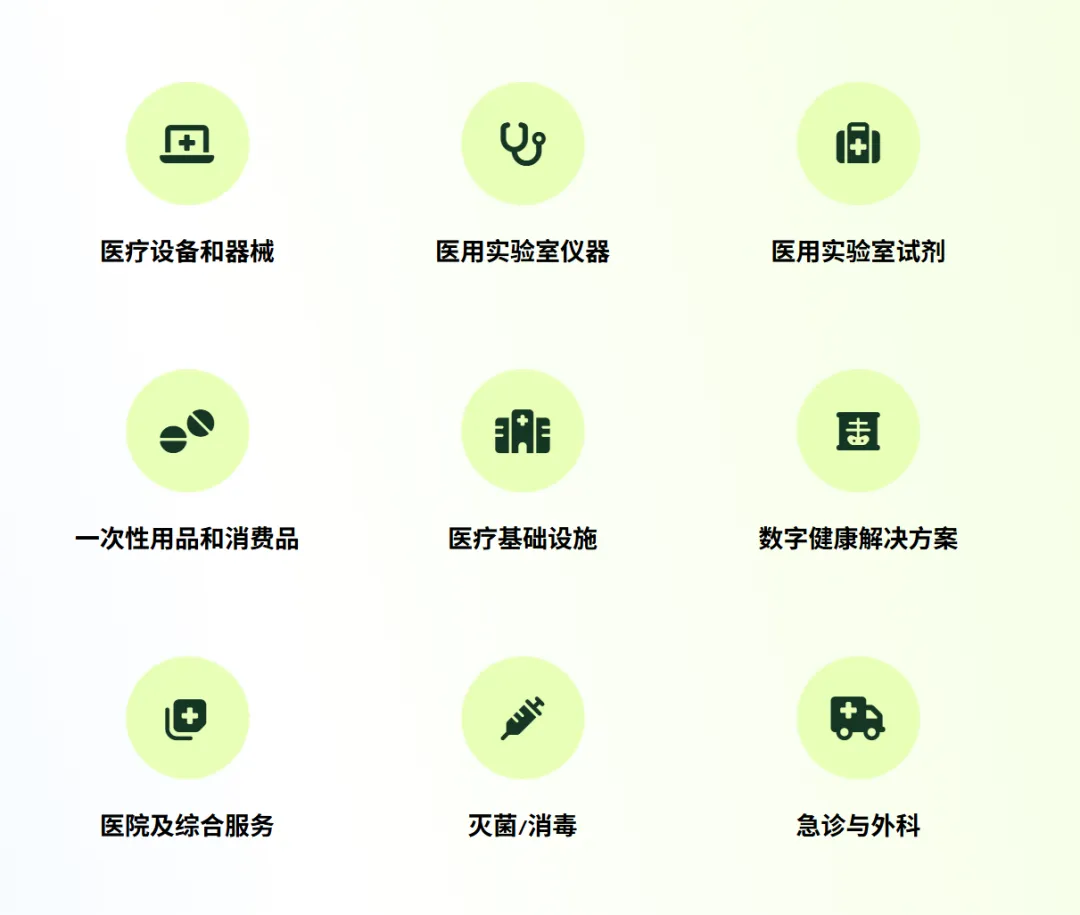 医疗实验室检验产品: 检验分析仪器,诊断设备、试剂及耗材,实验室设备与仪器,一次性医疗用品,医用敷料及卫生材 料,生物类产品等 。