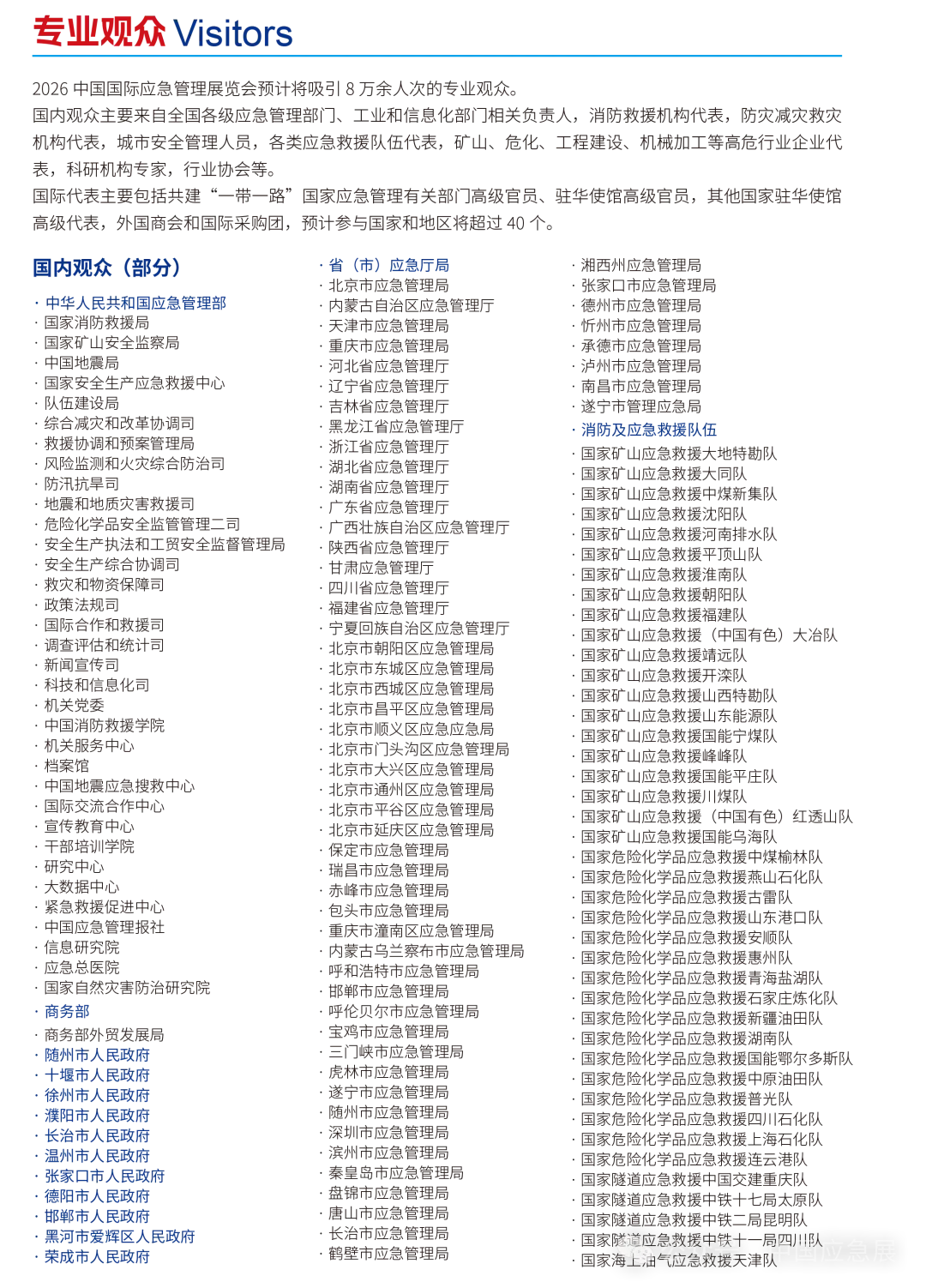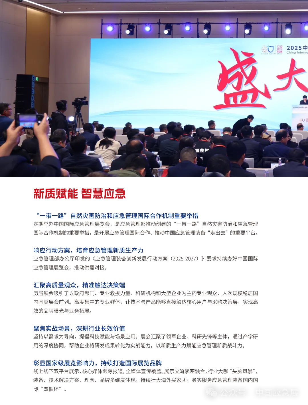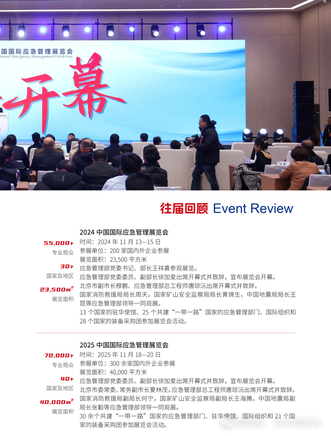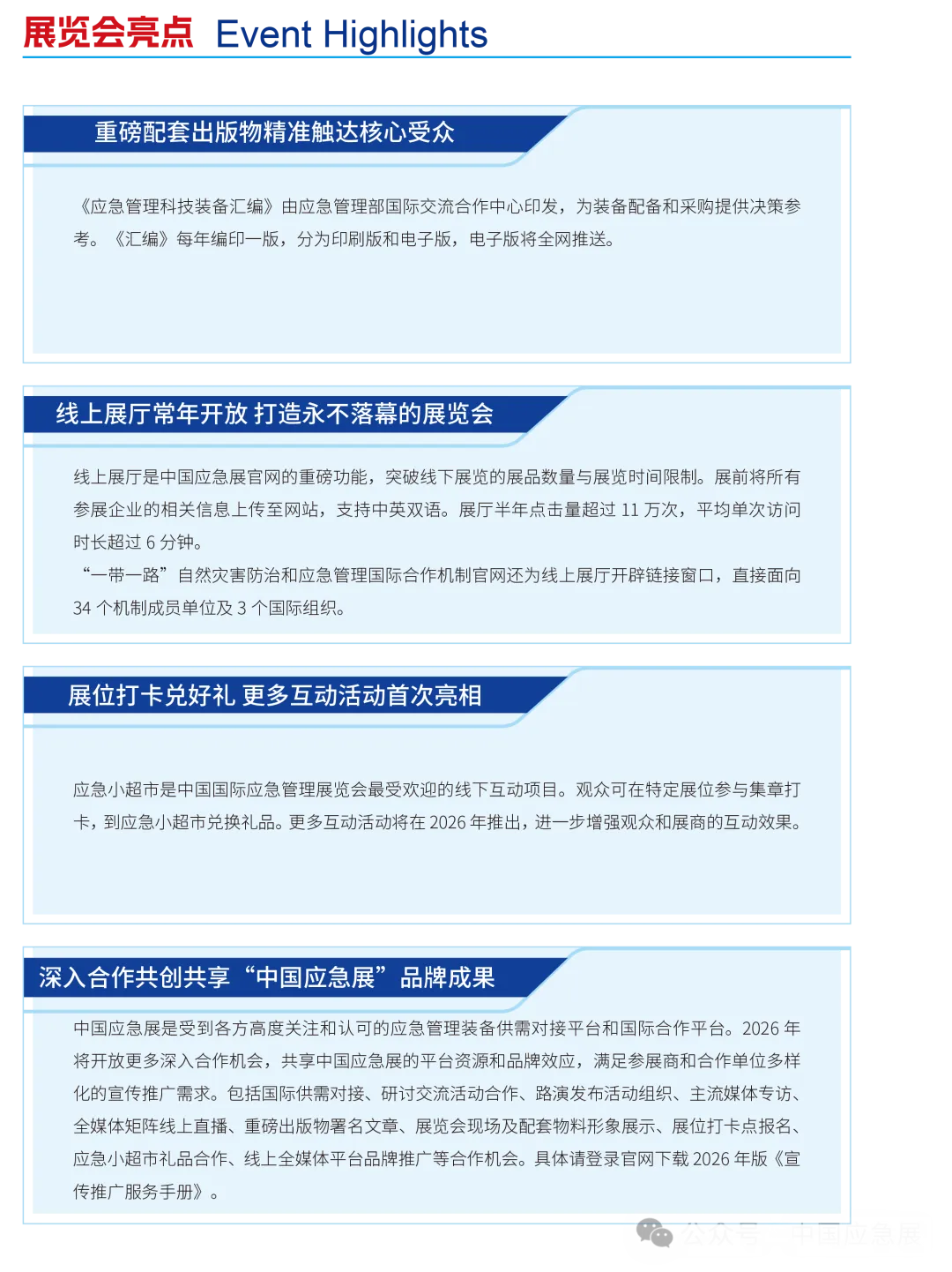 2026中国应急展由应急管理部国际交流合作中心主办、北京朗泰华科技发展中心(应急管理部国际交流合作中心所属企业)承办,将遴选350家左右中外企业、科研机构、产业聚集地、行业组织,面向各级应急管理部门、各类应急救援力量、各类企业、有关外国机构和国际组织等集中展示应急管理信息化、消防救援、防灾减灾救灾、安全生产及事故救援四个领域的先进适用技术装备。