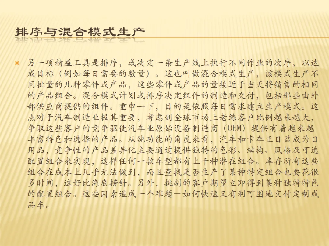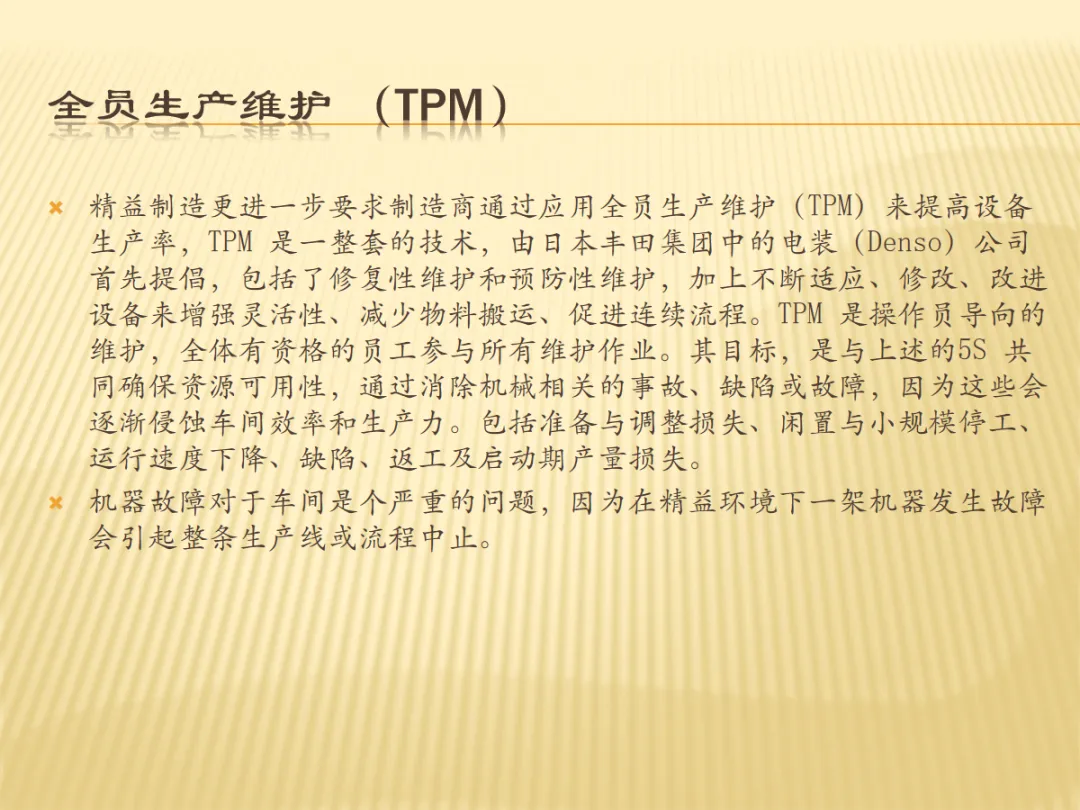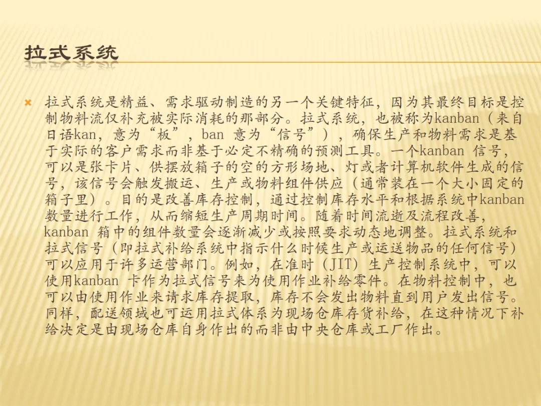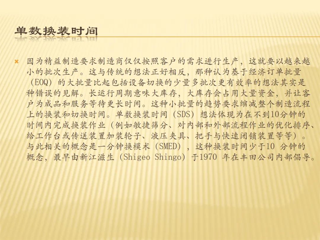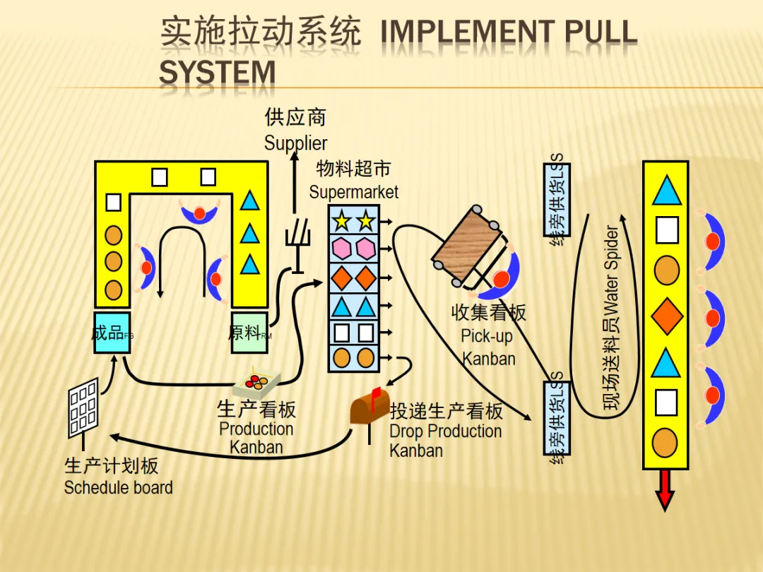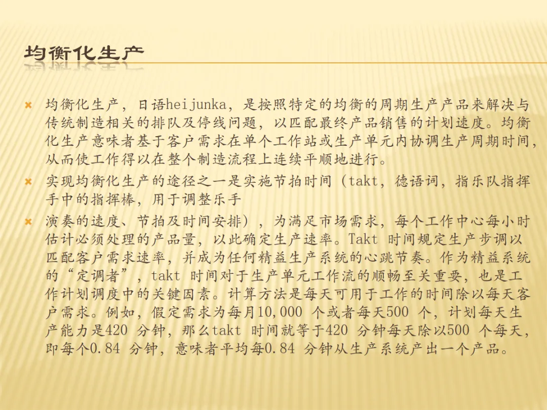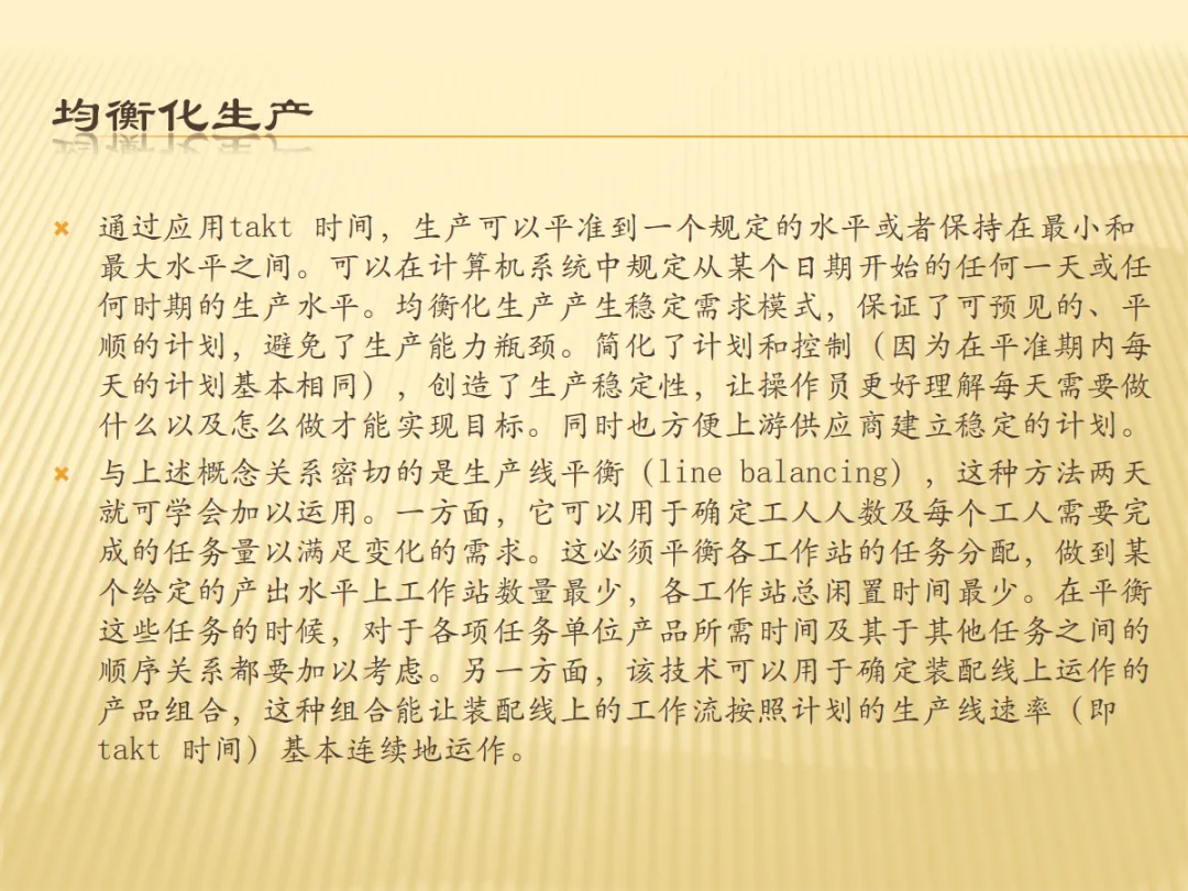 本文系统性地阐述了精益生产的核心工具、系统设计与实施策略,构建了一个从理论到实践的完整框架。内容围绕精益生产系统(Lean Production System) 展开,强调通过及时生产(JIT)与自働化(Jidoka)两大支柱,结合均衡生产(Heijunka),实现质量、成本、交付与安全的综合优化。文中详细介绍了12种精益工具,包括5S、目视控制、标准化作业、防差错、全员生产维护、单元式制造、单数换装时间、拉式系统、排序与混合模式生产、作业成本法以及均衡化与混流制造等,这些工具共同作用于消除生产过程中的浪费、提升流程稳定性与响应速度。PPT还深入探讨了生产线布局设计(如U型线、直型线等),并强调通过节拍时间(Takt Time)同步生产与客户需求,实现单件流与拉动系统,最终达到灵活、高效、可持续的生产运作。整体而言,该资料不仅提供了精益生产的理论核心,更侧重于系统化实施的方法与工具,为企业推进精益转型提供了具备操作性的指导蓝图。