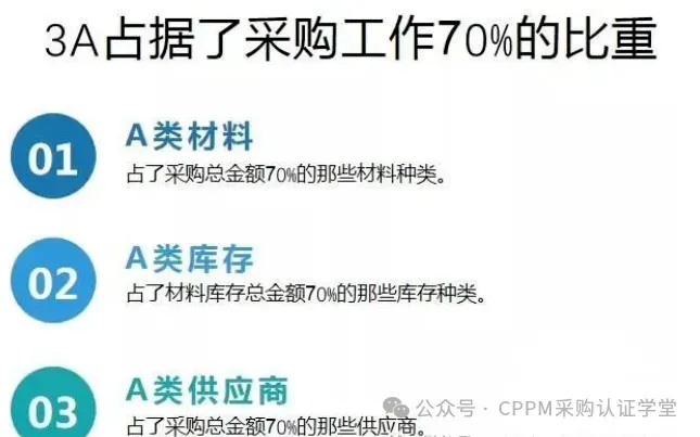 这些内容占了采购工作70%的比重,简称3A,只要把3A都管好了,就是一个合格的采购人员,可以问心无愧了。评估采购人员的业绩,首先要看的就是对3A的管理效果。