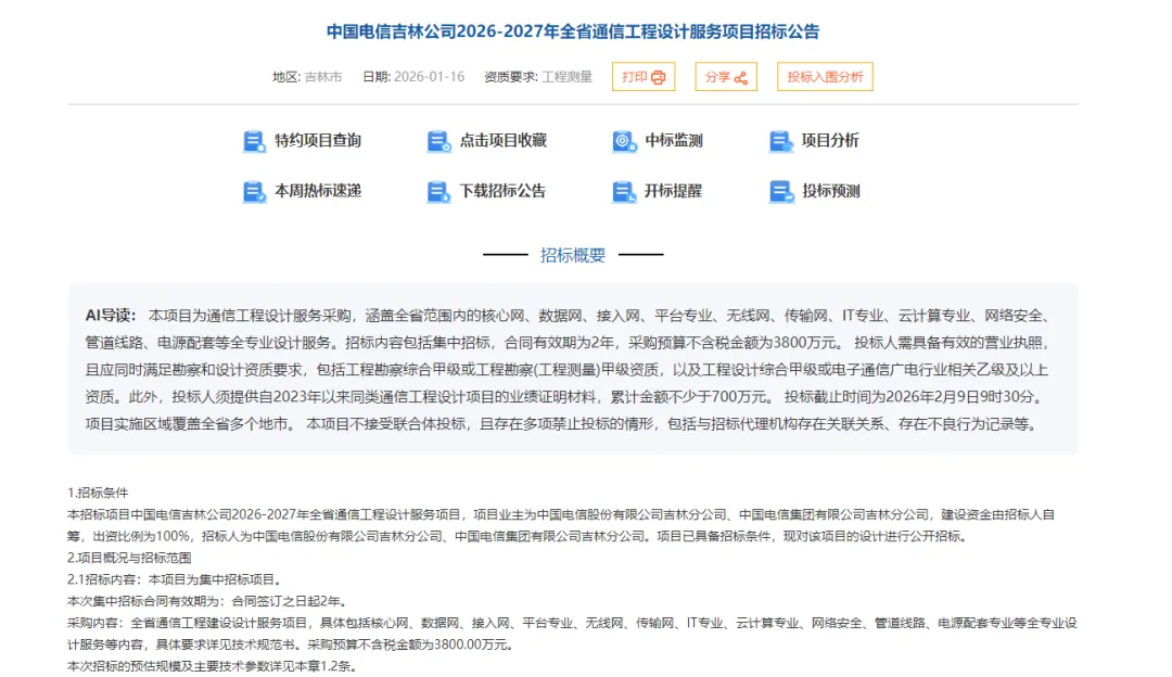 引言:在通信行业不断发展的当下,通信工程设计服务的质量与水平至关重要。2026 年 1 月 17 日,中国电信股份有限公司吉林分公司、中国电信集团有限公司吉林分公司发布招标公告,正式拉开了 2026 - 2027 年全省通信工程设计服务项目招标的大幕,这场招标盛宴吸引着众多业内企业的目光。