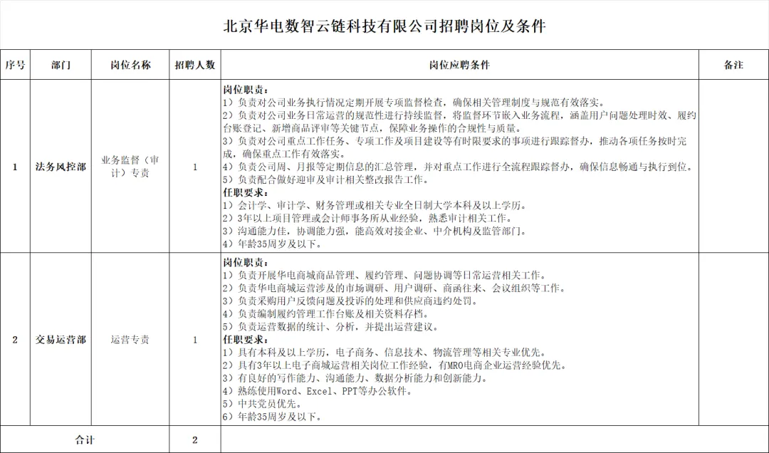 北京华电数智云链科技有限公司是中国华电集团物资有限公司的全资子公司,是利用科技信息技术助力集团公司数字化转型和数字经济发展的重要支撑力量,专注于中国华电集团电子商务平台的开发和运营。现面向华电系统内外开展公开招聘工作,有关招聘事项公告如下: