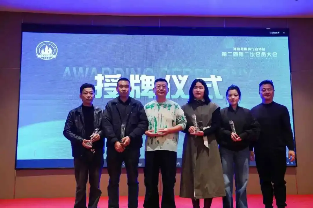 行业繁荣离不开新鲜血液。2025年,协会迎来嘉兴道禾服饰有限公司、启寰跨境电子商务(嘉兴)有限公司、海盐县武原潮洋服装厂、海盐县澉浦从壹文化工作室、嘉兴壹加绘智能设备有限公司五家新成员。协会副会长单位国松家居吴国其先生为新会员授牌,并寄语:“期待新伙伴在协会平台找准定位,与全体会员携手共进!”