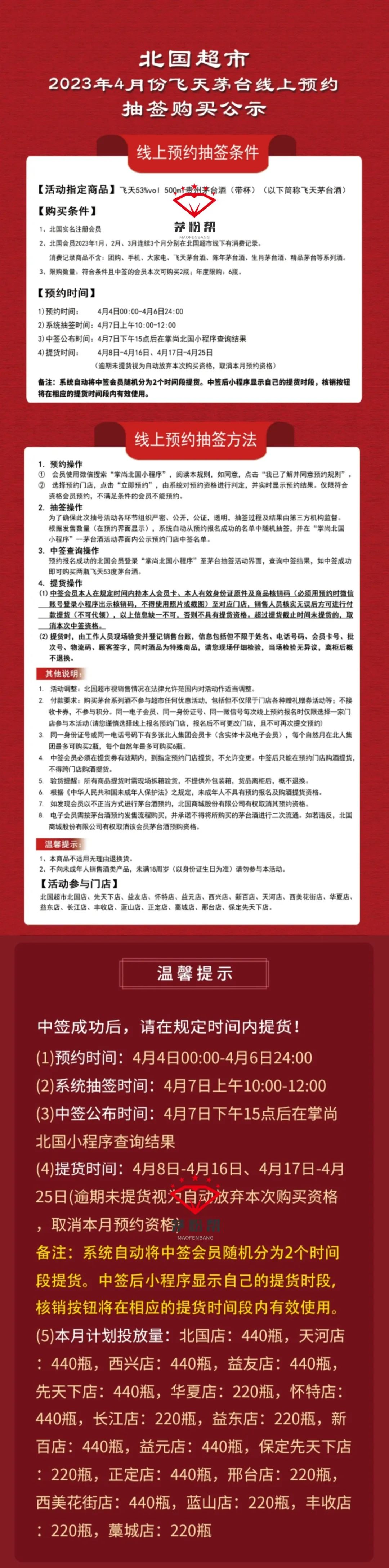 北国超市4月份飞天茅台线上预约抽签活动开启了!