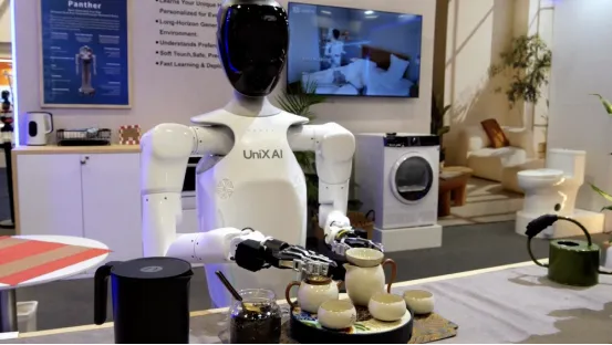 由中国UniX AI公司开发的“旺达”具身机器人在CES 2026上表演泡茶(图片来源于网络,如有侵权请联系删除)
