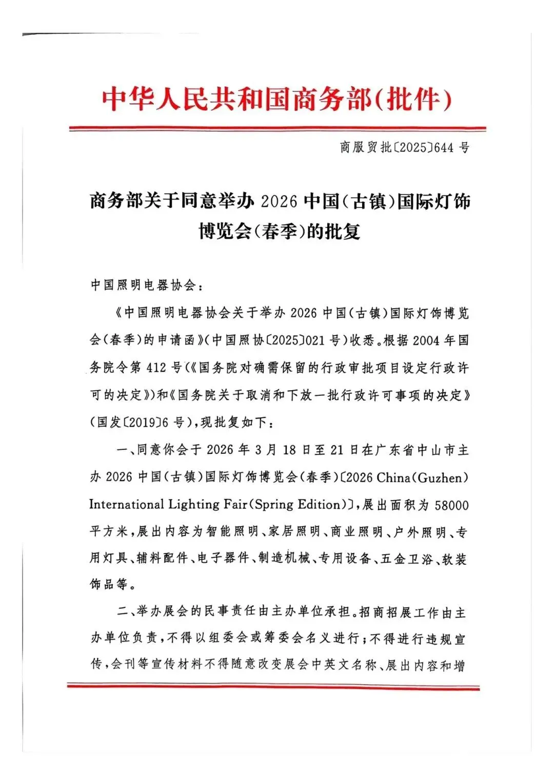 2025年12月22日,商务部发布《商务部关于同意举办2026中国(古镇)国际灯饰博览会(春季)的批复》同意于今年3月18-21日举办2026中国(古镇)国际灯饰博览会(春季)。此次商务部批复不仅肯定古镇灯博会在照明灯饰行业展览领域多年来的卓越地位,也将推动展会成为链接全球供需、引领技术风潮的重要枢纽,助力照明灯饰企业把握行业新发展格局下的市场机遇。