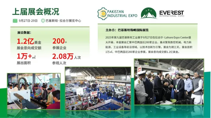 2025年第九届巴基斯坦工业展于9月在拉合尔·Lahore Expo Center 盛大开幕,展会汇聚中巴两国近200家企业,重点聚焦数控机械、电力新能源、工业设备等前沿领域,以技术创新为引擎,为巴基斯坦工业发展注入强劲动力。