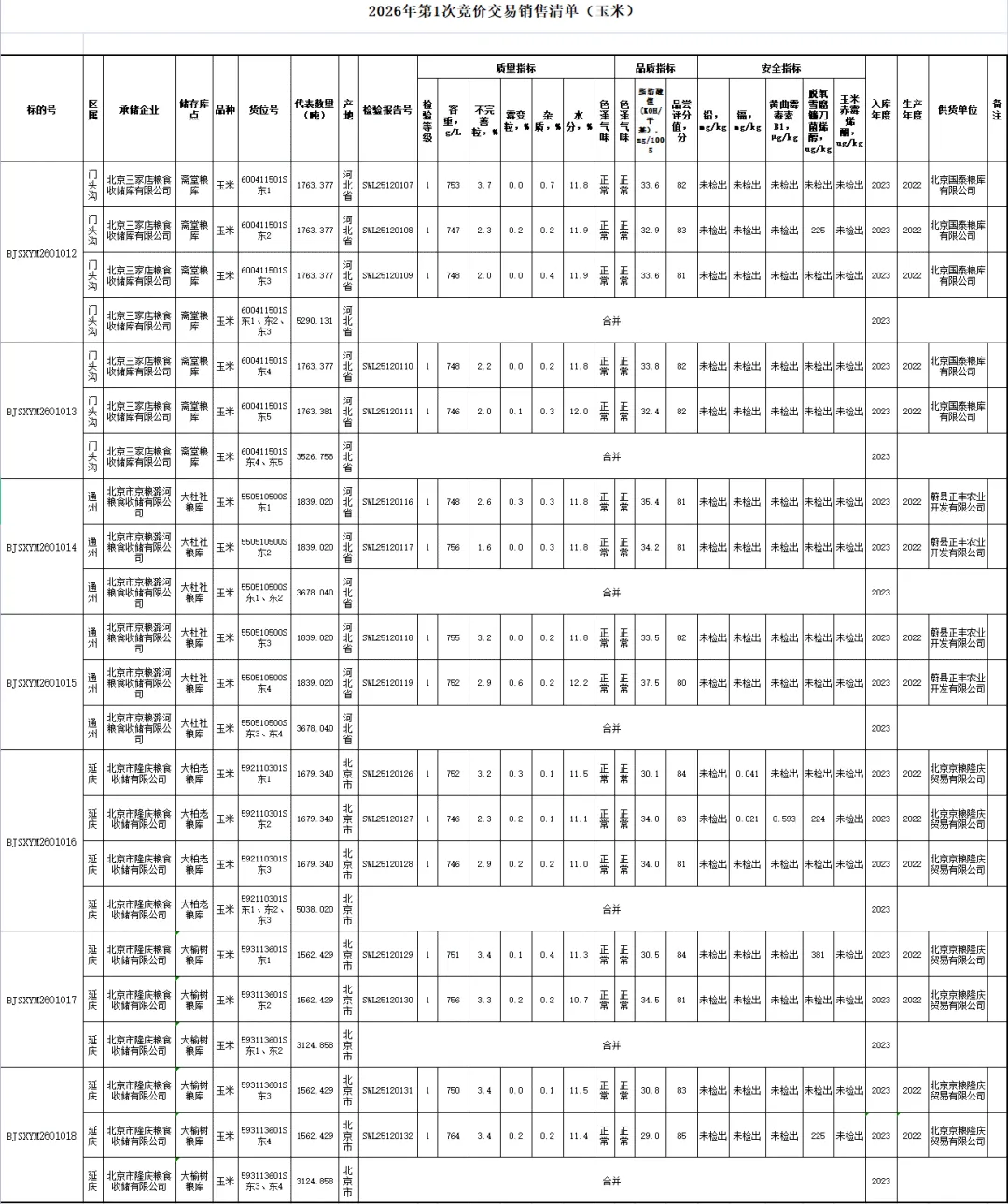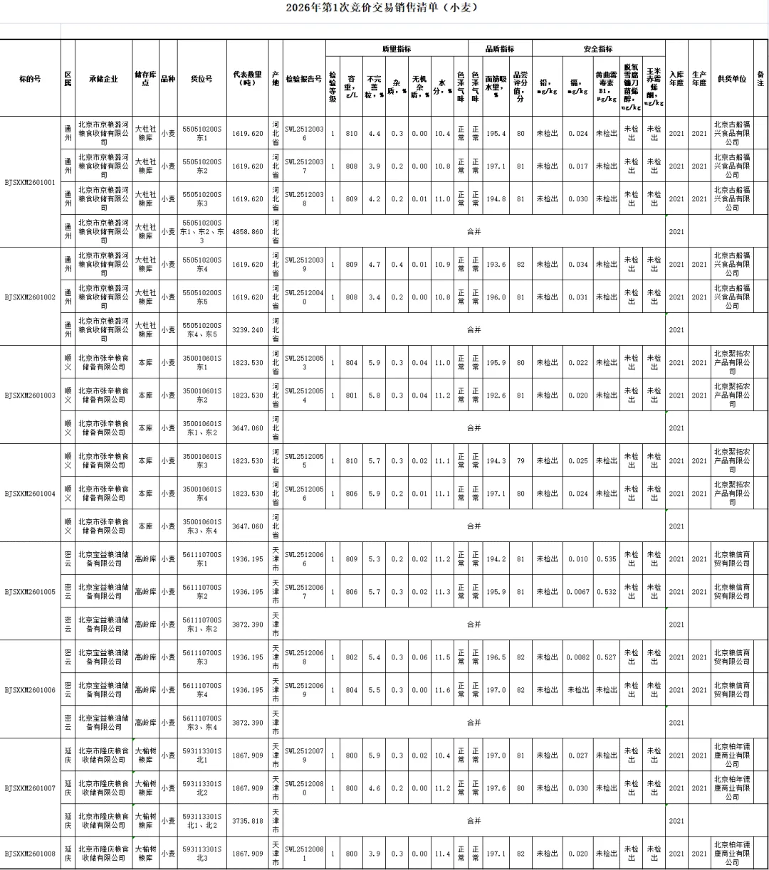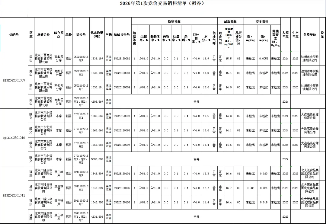 (清单)2026年北京市储备粮油第一次竞价交易会竞价销售