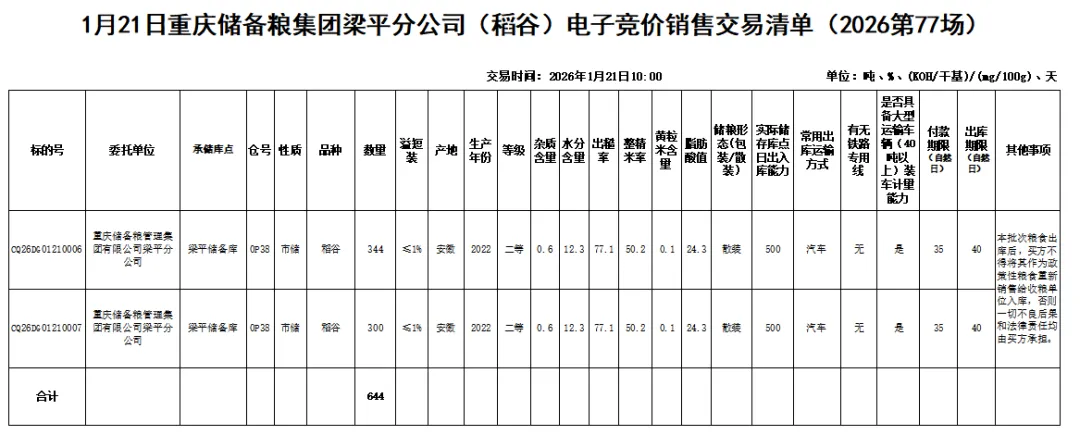 受重庆储备粮管理集团有限公司梁平分公司委托,重庆市粮油批发市场有限责任公司(即国家粮食重庆交易中心,以下简称“批发市场公司”),定于2026年1月21日10:00举办重庆储备粮集团梁平分公司(稻谷)电子竞价销售交易会,现将有关事项公告如下: