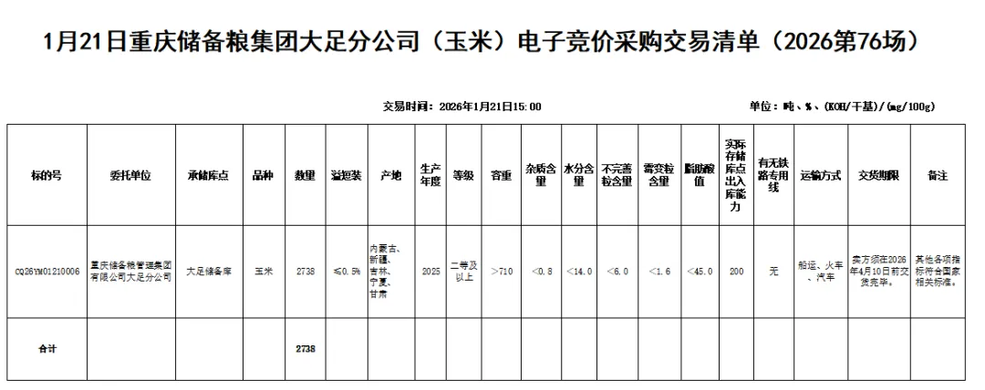 受重庆储备粮管理集团有限公司大足分公司委托,重庆市粮油批发市场有限责任公司(即国家粮食重庆交易中心,以下简称“批发市场公司”)定于2026年1月21日15:00举办重庆储备粮集团大足分公司(玉米)电子竞价采购交易会,现将有关事项公告如下: