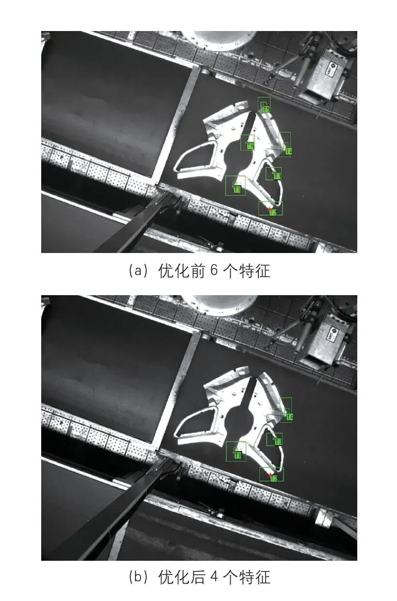 汽车制造业生产的小零件,无明显的孔作为特征点选取,特征点选取少会影响视觉对零件校正的精准度,从而影响机器人对零件抓取的准确度。在进行多次测试后,通过更改特征点选取方式(由孔改成角)和减少特征点个数(由6 改成4)的方式,多次测试成像结果,确保零件测量结果无问题,解决小零件视觉识别问题(图7)。