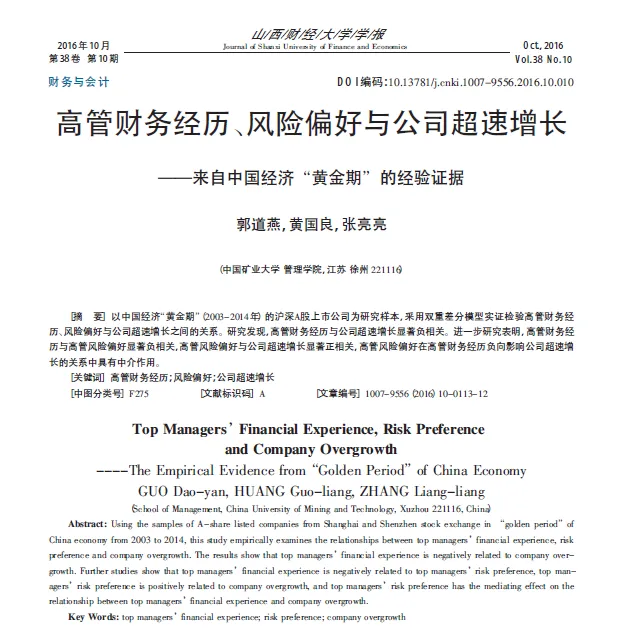 郭道燕, 黄国良, 张亮亮. 高管财务经历、风险偏好与公司超速增长——来自中国经济“黄金期”的经验证据[J]. 山西财经大学学报, 2016, 38(10):113-124.