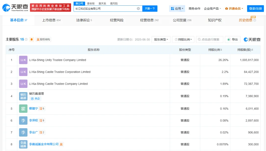 李嘉诚家族通过一系列信托及公司持有长和的多数股份。据天眼查显示,Li Ka-Shing Unity Trustee Company Limited持有长江和记实业有限公司26.26%的股份,是单一最大股东。