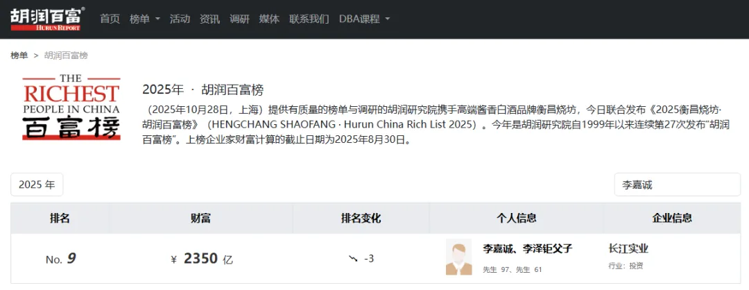 如今,李嘉诚已经于2018年卸任长江集团主席一职,专注于李嘉诚基金会的工作。据《2025胡润百富榜》显示,李嘉诚、李泽钜父子最新财富为2350亿,排名第九。
