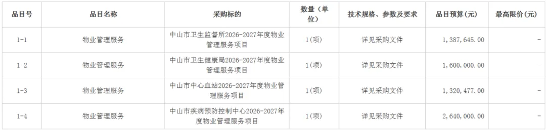 1、采购包1(中山市卫生健康局大院2026-2027年度物业管理服务项目):采购包预算金额:6,948,122.00元;