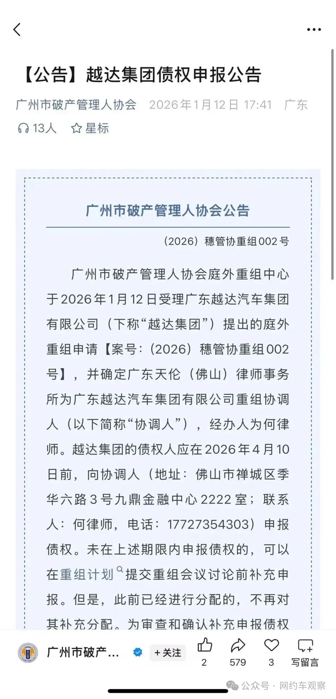 1月12日,广州市破产管理人协会发布《越达集团债权申报公告》,引爆年网约车行业2026第一颗“惊雷”。