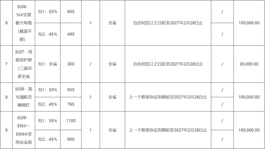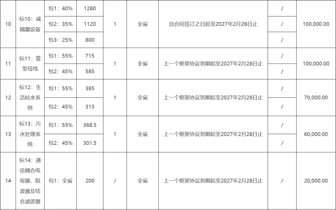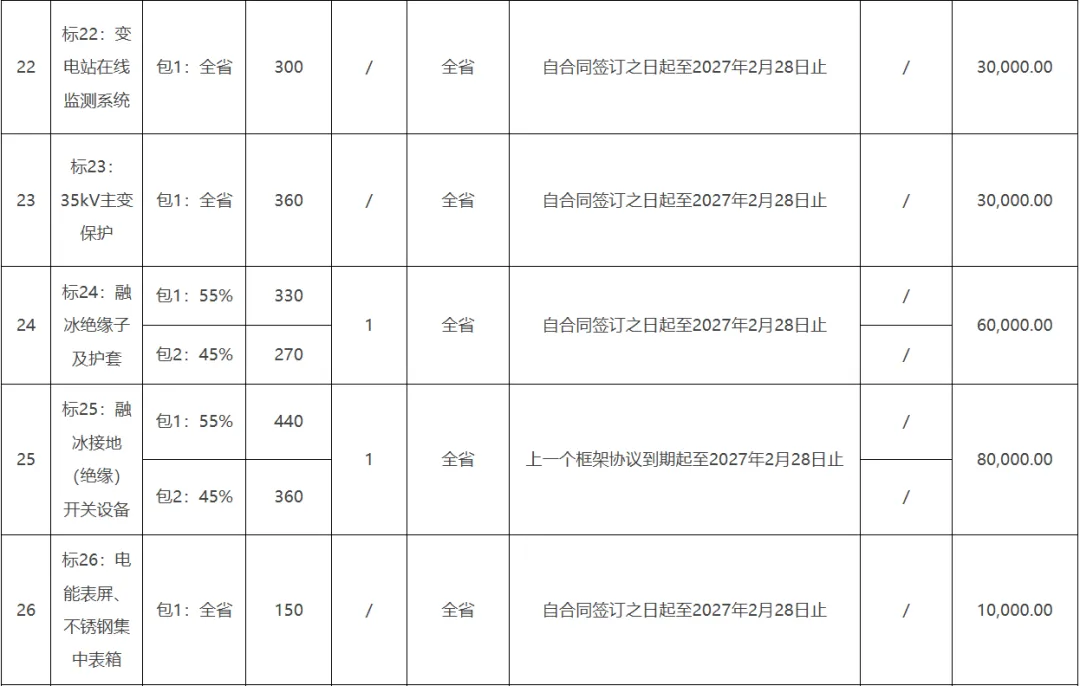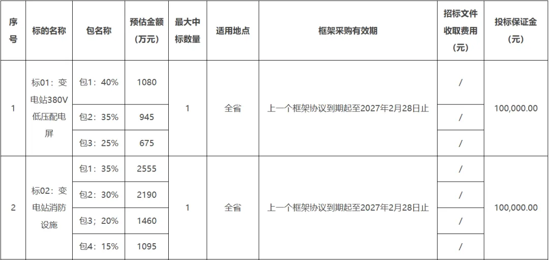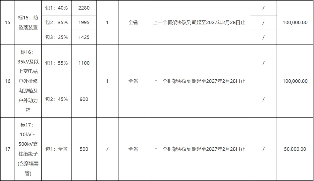 2.5招标分类:框架(框架招标有效期:标01-标03、标05、标08-标09、标11-标17、标25:上一个框架协议到期起至2027年2月28日止;标04、标06-标07、标10、标18-标24、标26-标32:自合同签订之日起至2027年2月28日止。实际分配金额下限不低于预估金额的80%,分配金额上限不高于预估金额的150%。对中标供应商的实际分配金额未达到预估金额下限的,应延长该供应商的协议有效期限,延长期限原则上不超过一年。在延长期内,该框架协议的实际分配金额达到下限时立即终止框架协议。延长期满仍未达到下限,自动终止框架协议。当框架协议有效期(含延长期)发生中标供应商被取消中标资格,除有特殊采购需求情形外,自被取消中标资格之日起框架合同自动终止,其未履行合同部分的供应量优先采用其他供应商足额部分进行弥补,仍然有缺额的,则剩余份额按照其他供应商中标相对比例重新分配。超出其他供应商原足额部分的,应征求供应商意见。对于因国家、行业或企业有关标准发生调整,原有规格型号已不能满足安全、生产要求且供应商无法供应对应品类新式型号的,经协商可提前终止协议。)。