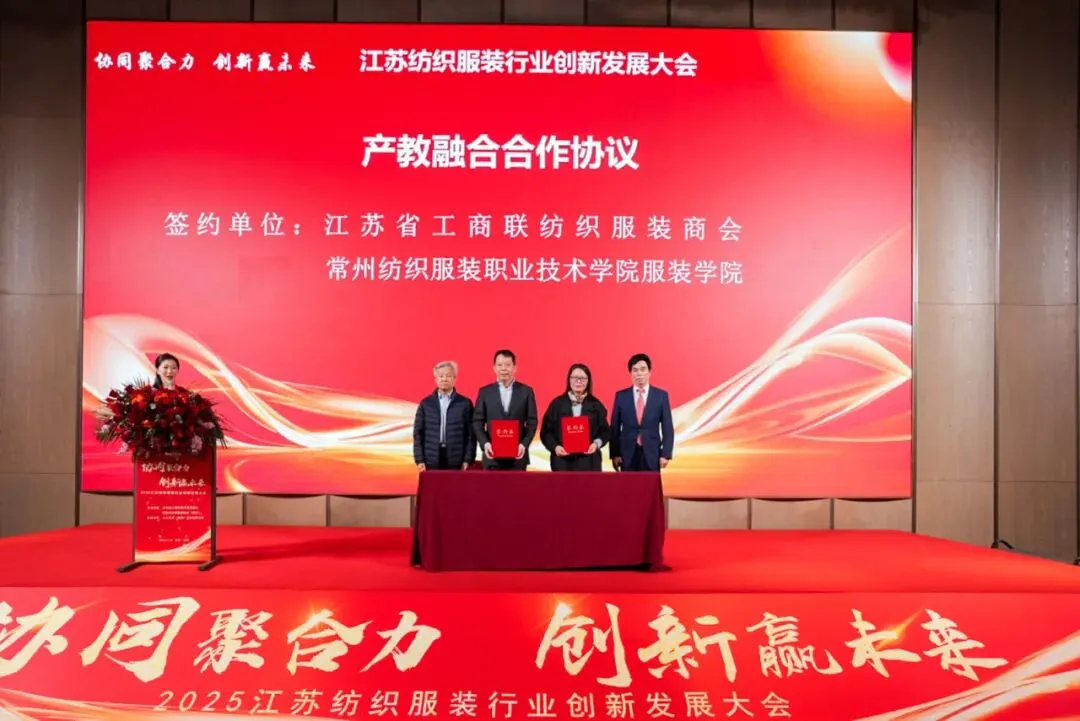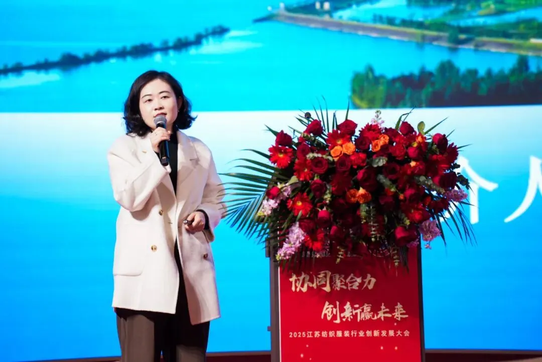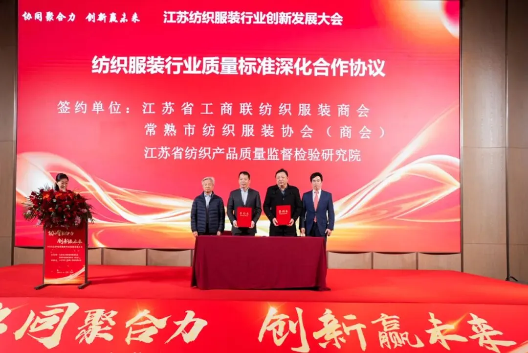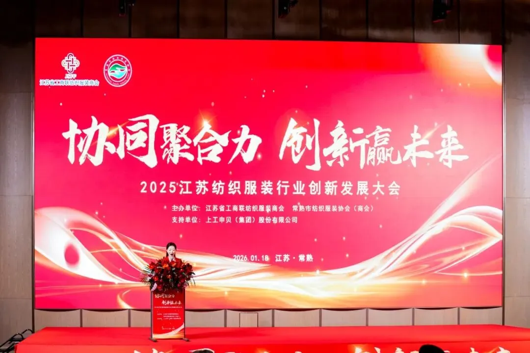 1月18日下午,江苏纺织服装行业创新发展大会在常熟昆承湖凯悦酒店隆重召开。本次大会以“协同聚合力 创新赢未来”为主题,汇聚行业领导、专家学者及企业代表近300人出席会议,共同探讨纺织服装行业转型升级与高质量发展路径。
